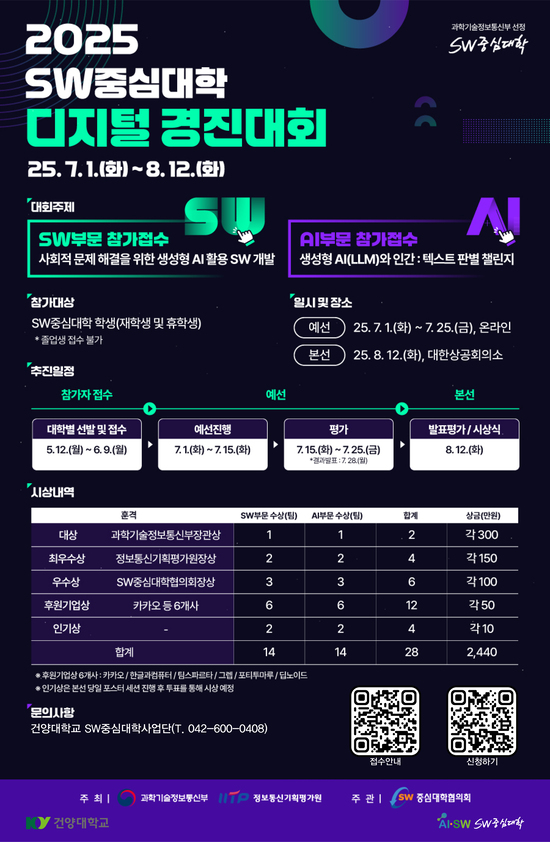 □ 참가대상 - SW중심대학 학생(재학생 및 휴학생) - 졸업생 접수 불가 □ 대회 일시 및 장소 - 예선 : [일시] 2025.07.01.(화) ~ 07.25.(금) [장소] 온라인 - 본선 : [일시] 2025.08.12.(화) [장소] 대한상공회의소 □ 대회 신청 방법 - QR코드 신청 □ 프로그램 지원 기간 - 2025.05.12(월) ~ 2025.06.09(월)